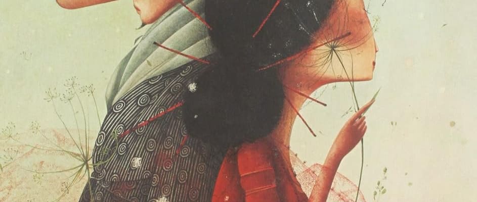 Cette histoire emblématique imaginée au XIXème siècle par Edmond Rostand dans la pièce Cyrano de Bergeracn’a jamais cessé d’inspirer les artistes. C’est ainsi que Taï-Marc Le Thanh et l’illustratrice talentueuse Rebecca Dautremer se sont emparés de ce fleuron de la littérature française dans un album sublime destiné à un public plus jeune. Quoi de mieux pour attirer nos chers têtes blondes vers la littérature que de leur présenter des illustrations d’une extrême finesse, et truffées de petits détails qui mettent en valeur le texte et qui sont autant à décrypter que l’histoire elle-même. Ce sont des jeux d’ombres et des voiles fins derrière lesquels se dissimule Cyrano, les couleurs des robes de Roxanne et ses parures qui soulignent l’évolution du personnage, le jeu des couleurs dominées par le vert pour Cyrano et le rouge pour Roxanne…. Loin du cadre du XIXème siècle de la pièce de théâtre, l’illustratrice propose une esthétique très japonisante. Les yeux des personnages sont bridés, le costume des hommes sont des kimonos, la scène de la guerre dans laquelle périt Christian nous transporte dans un Japon d’un autre temps.