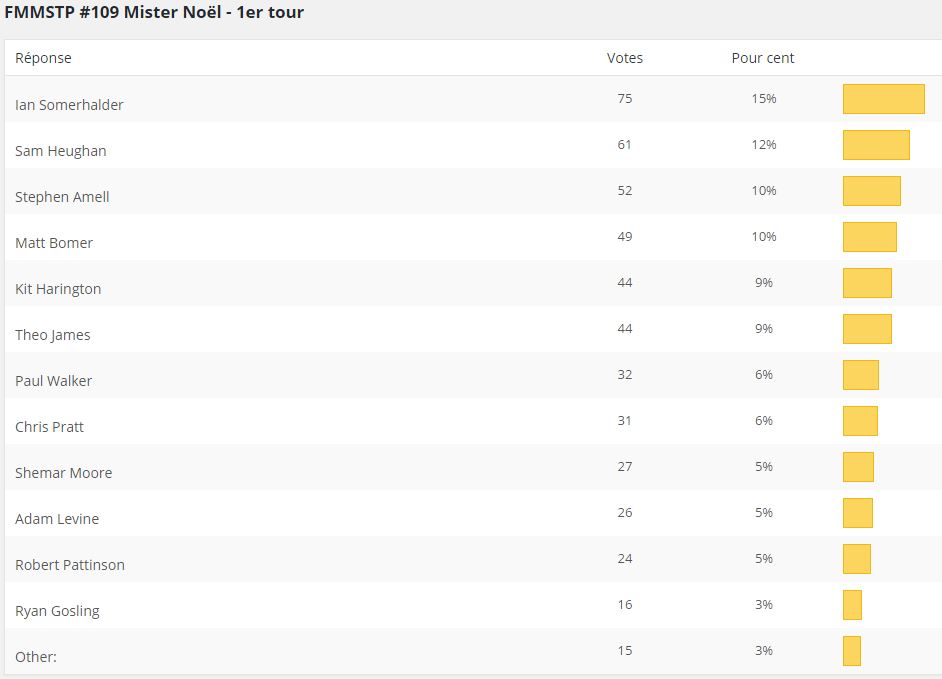 Bon, passons aux choses sérieuses avec l’élection de MISTER NOËL ! Les compteurs sont remis à zéro et vous ne pourrez cette fois voter que pour un seul d’entre eux. Choisissez donc bien qui sera notre Mister Nöel de Songe.