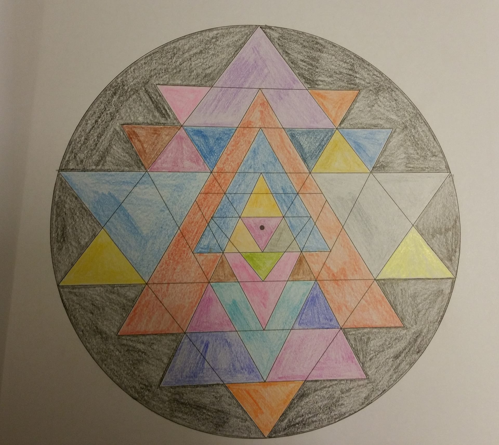 Des triangles, plein de triangles (défi : les compter !) Seul hic, je n’ai pas de crayons de couleur de bonne qualité, ce qui fait que l’on voit les traits de coloriage.